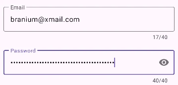 - Nếu chỉ muốn cho nhập liệu tối đa 40 kí tự, ta thiết lập thuộc tính maxLength=”40″ trong TextInputEditText tương ứng:
