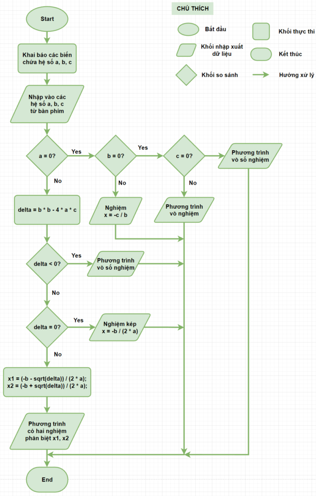 Ví dụ 3. Vẽ sơ đồ khối giải phương trình bậc hai