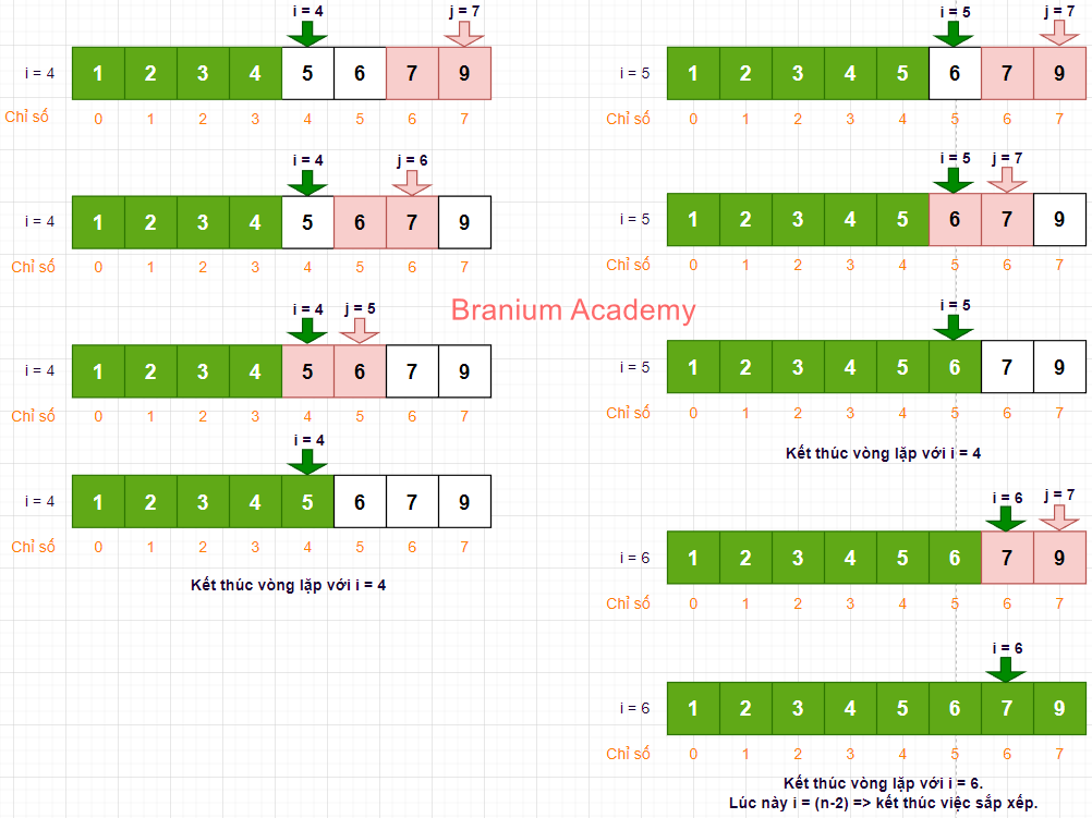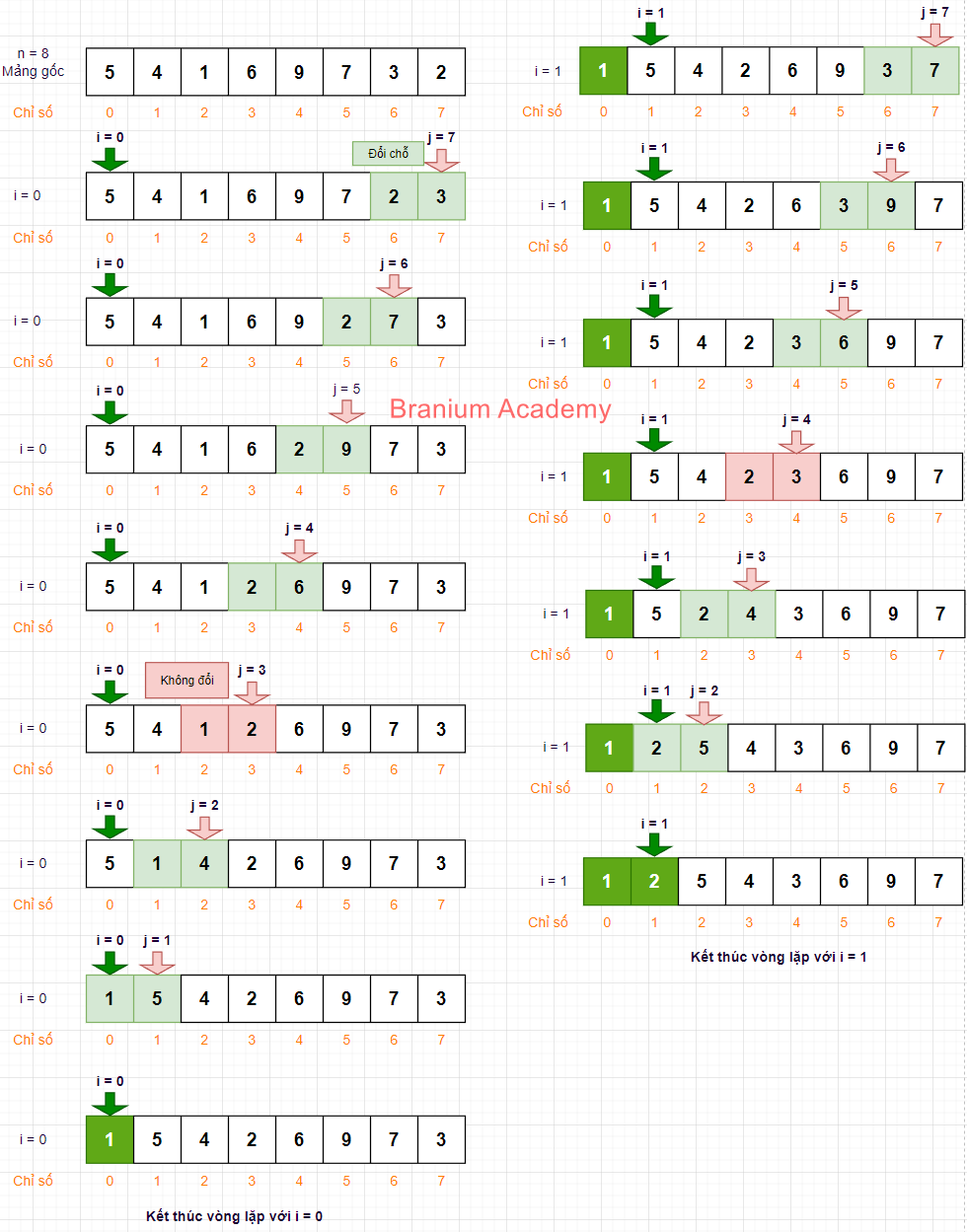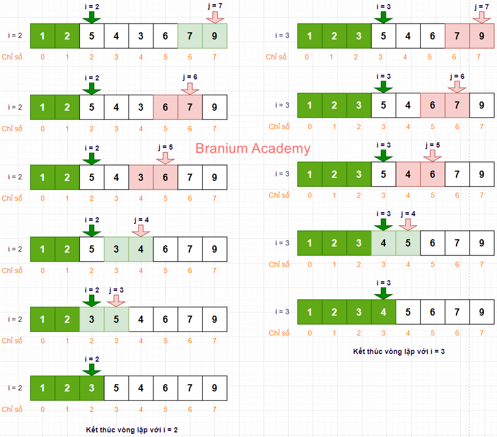 - Mũi tên trên đầu thể hiện vị trí của chỉ số i, j tại thời điểm thuật toán đang hoạt động.