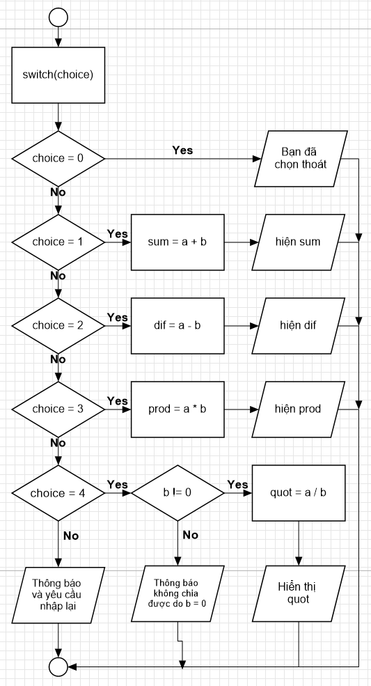 - Ví dụ 2: Viết chương trình cho phép người dùng nhập vào 2 số nguyên và các lựa chọn từ 0-4 và thực hiện các chức năng tương ứng như sau: