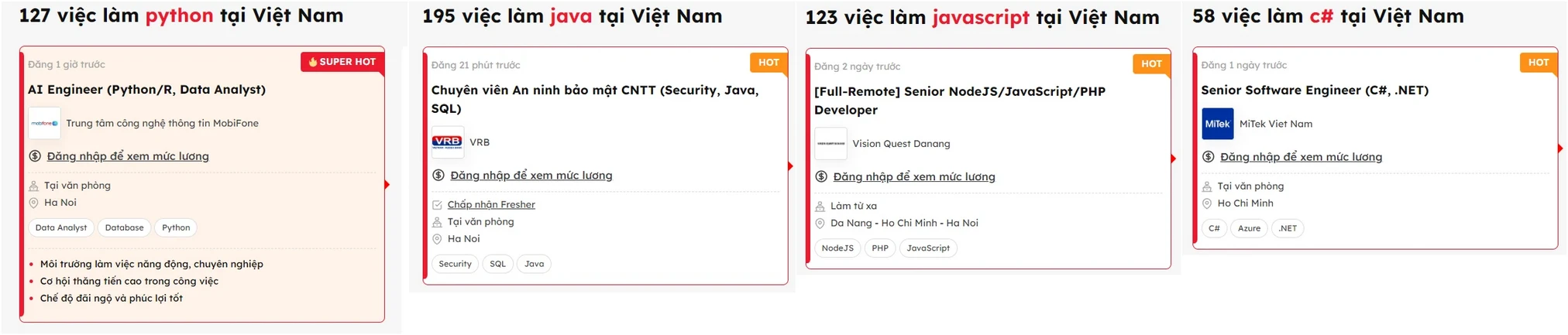 - Lưu ý rằng trên đây chỉ là thống kê tại 1 thời điểm và tại 1 trang tuyển dụng. Bạn có thể tham khảo thêm trên các trang tuyển dụng khác.