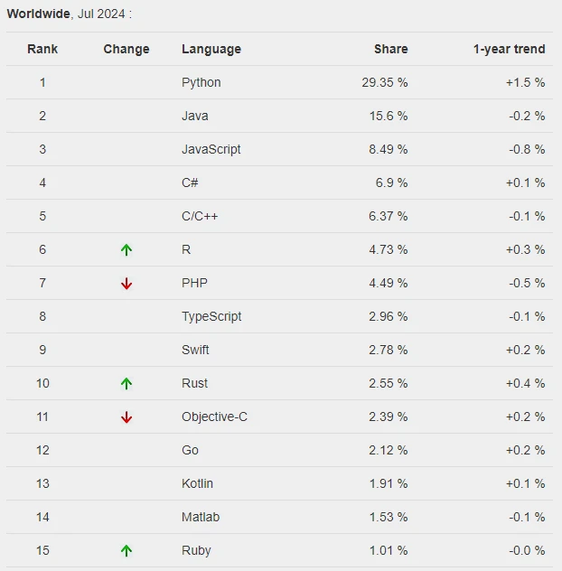 - Sau đây là top 15 các ngôn ngữ lập trình phát triển nhất tại thời điểm tháng 7/2024 theo PYPL: