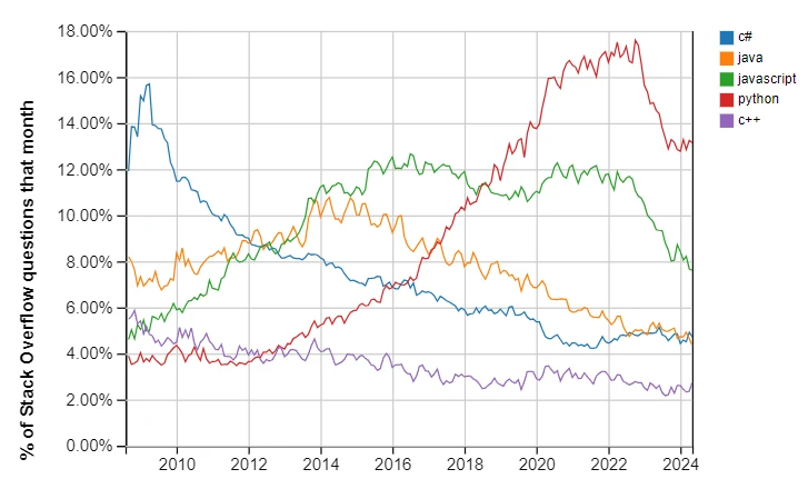 - Khảo sát trên stackoverflow.com cho ta thấy Python là ngôn ngữ lập trình chính phát triển nhanh nhất trong thời gian dài: