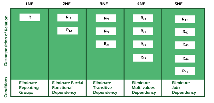 - 5NF: Một quan hệ ở dạng chuẩn 5 nếu thỏa mãn chuẩn 4 và không chứa bất kỳ phụ thuộc kết nối nào. Việc kết nối nên bị loại bỏ.