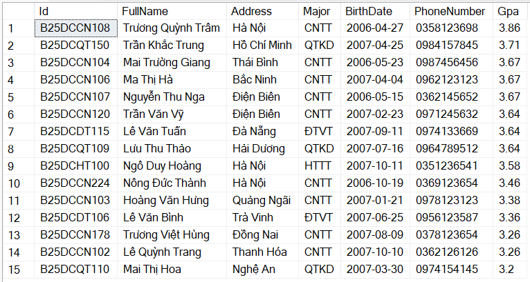 - Hãy cho biết thông tin của các sinh viên có địa chỉ ở Hà Nội, sắp xếp kết quả giảm dần theo điểm TB.