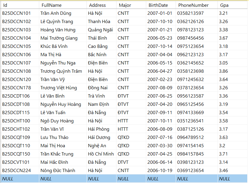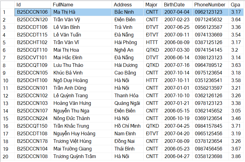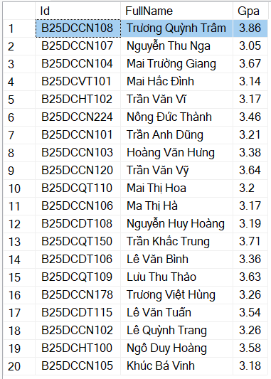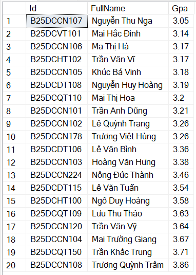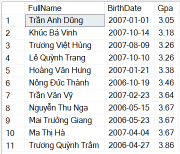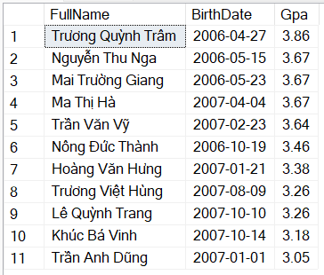 - Ví dụ 5_sắp xếp theo tiêu chí không bao gồm trong vế SELECT: Cho biết mã, tên, điểm các sinh viên trong bảng Student sắp xếp tăng dần theo ngày sinh.