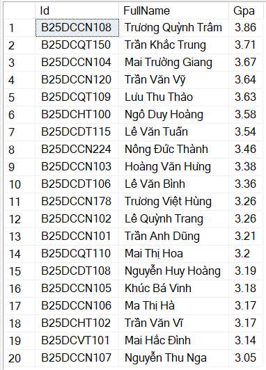 - Ví dụ 1_sắp xếp giảm dần theo 1 tiêu chí: cho biết mã, tên, điểm TB các sinh viên trong bảng Student. Kết quả sắp xếp giảm dần theo điểm TB.
